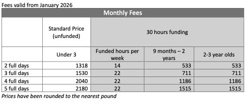 For ease, and so you can easily compare our prices with those of other nurseries, the table above shows the monthly costs depending on the number of full days your child spends with us. Our standard opening times are 8am – 6pm, Monday to Friday.