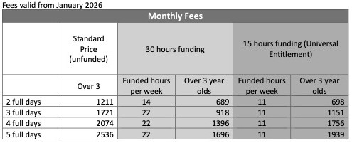 Where Attendance Hours are less than 20 a surcharge will apply. The surcharge for this would be double the weekly charge (so you would pay 3 times the usual weekly price). We therefore highly recommend selecting an attendance of over 20 hours per week when not eligible for funding or taking chargeable hours in excess of funded hours.