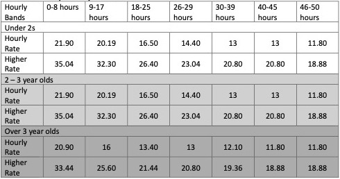 Where funded parents wish to purchase hours in excess of Funded Hours, this must be done so that the attendance for the day starts at 8am or finishes at 6pm (in some of our nurseries it is also possible to finish at 1pm). The weekly charge for these hours is calculated using the Hourly Rate table below. Please Note: This rate will be greater where the booked attendance day starts after 8am or finishes prior to 6pm (shown below as the “higher rate”). Parents attending for funded hours only must do so for the full funded hours on offer during the day up to the maximum available.